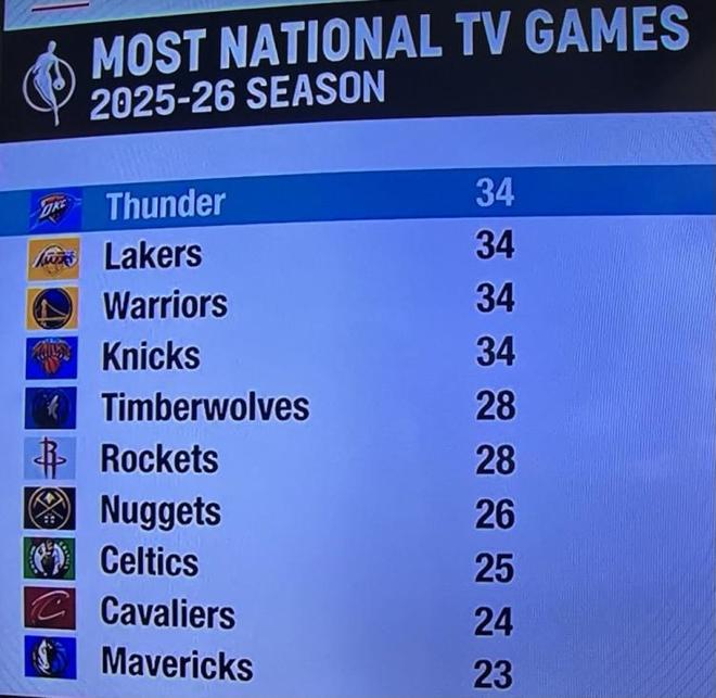 新赛季全美直播场次:湖人勇士雷霆尼克斯34场联盟最多 火狼28场